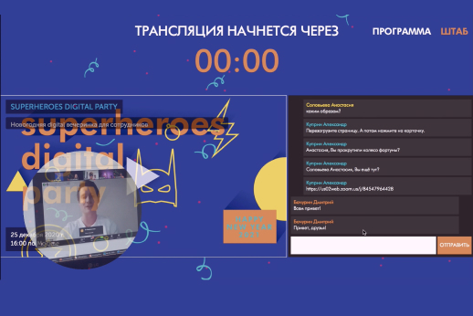 Организация онлайн-празднования Нового года для сотрудников и партнёров компании в условиях пандемии. Создание закрытой онлайн-платформы с трансляцией поздравления от руководства, тематической викториной...